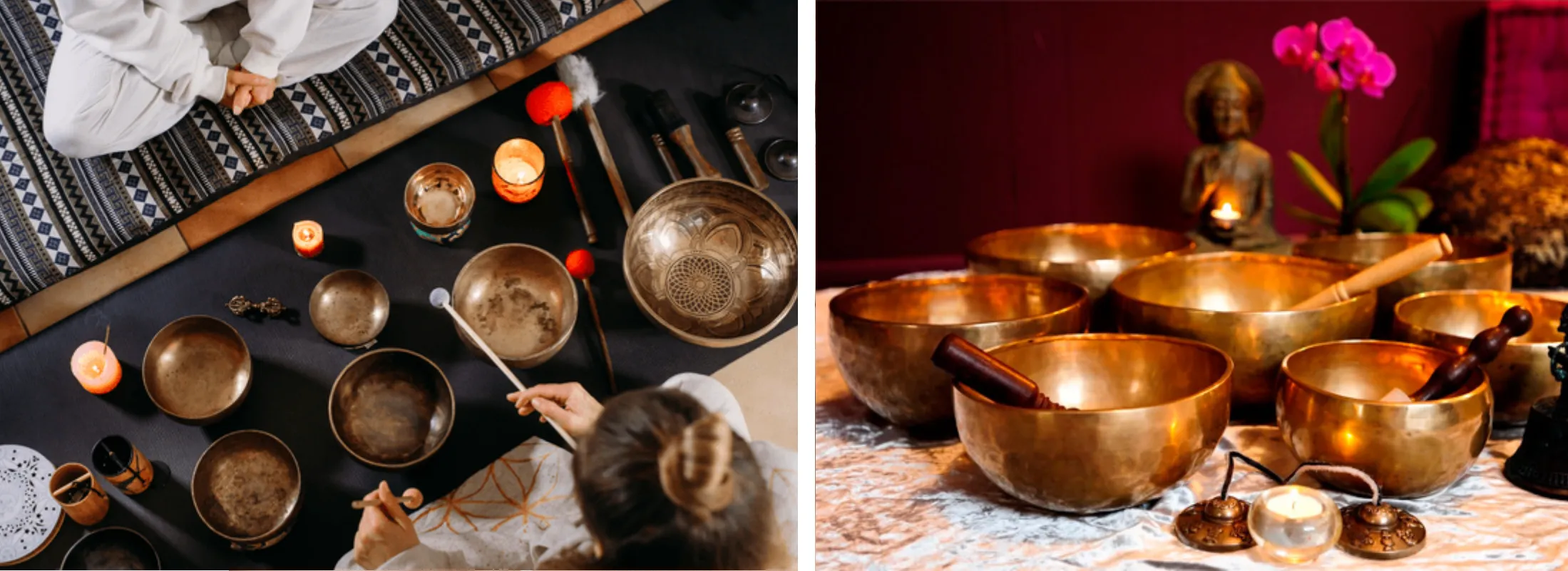 - Singing Bowls: These metal bowls produce harmonic sounds when struck or rubbed with a mallet. Singing bowl therapy utilises these traditional metal bowls to produce resonant tones and vibrations. As the bowls are struck and played, their soothing sounds penetrate deep within the mind and spirit, inducing relaxation, reducing stress, and promoting a sense of inner harmony.